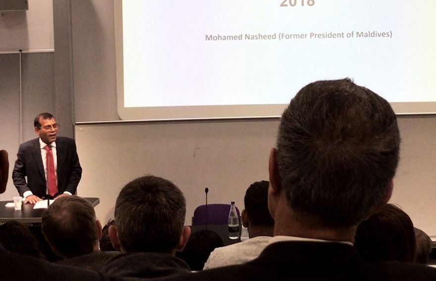 ސިޔާސީ ހިމާޔަތާ ގުޅޭ ގޮތުން ލަންޑަންގެ ސައުތު އޭޝިއާ އިނިސްޓިޓިއުޓްގައި ތަގުރީރު ކުރައްވަމުން ނަޝީދު ވިދާޅުވީ ބޭރުގައި ހުންނަވައި ކުރެއްވި މަސައްކަތުން، ބާރުތައް އެއްކުރައްވައިގެން ރައީސް ޔާމީން ހިންގަވަން އުޅުނު ކަންކަމަށް ފާރަވެރިވެ އެކަންކަން ފަޅާއަރުވާލެއްވުނު ކަމަށެވެ.