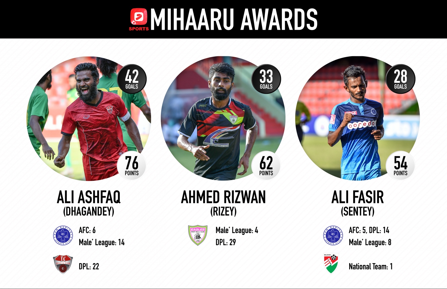 ފުޓްބޯޅަ ސީޒަނުގައި އެންމެ ގިނަ ލަނޑު ޖަހާ ކުޅުންތެރިޔާ އަށް "މިހާރު އެވޯޑްސް" ގައި ދޭ ރަންބޫޓް ޓީީސީ ސްޕޯޓްސް ކްލަބްގެ ފޯވާޑް އަލީ އަޝްފާގު (ދަގަނޑޭ) ކަށަވަރުކޮށްފި އެވެ.