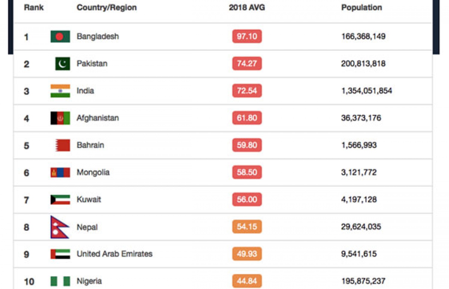 އެގޮތުން ވައި އެންމެ ތަޣައްޔަރު 10 ގައުމުގެ ތެރޭގައި ހިމެނެނީ ބަންގްލަދޭޝް، ޕާކިސްތާން، އިންޑިއާ، އަފްގާނިސްތާން، ބަހްރެއިން، މޮންގޯލިއާ، ކުވައިތު، ނޭޕާލް، ޔޫއޭއީ އަދި ނައިޖީރިއާ އެވެ.