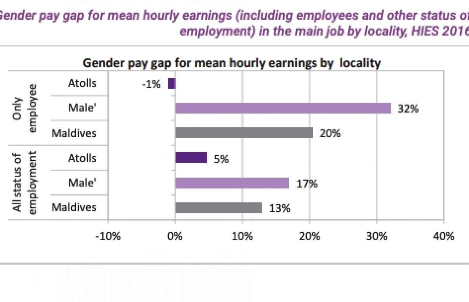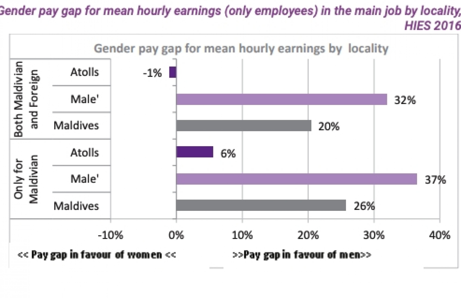 ފާހަގަކުރެވޭ އެއް ކަމަކީ، އަތޮޅުތަކުގައި، ހުރިހާ މަސައްކަތްތެރިންގެ ތެރޭގައި "ޖެންޑަ ޕޭ ގެޕް" ފަސް ޕަސެންޓަށް ބޮޑުވެގެންދާ ކަމެވެ. އޭގެ މާނައަކީ ފިރިހެނުންގެ އާމްދަނީ އަންހެނުންނަށް ވުރެ ފަސް ޕަސެންޓް ބޮޑެވެ.