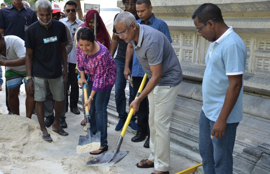ރައީސް ވަނީ ހެރިޓޭޖް މިނިސްޓަރު ޔުމްނާ މައުމޫނާއި އެ މިނިސްޓްރީގެ އިސް ބޭފުޅުންނާއެކު ހުކުރު މިސްކިތު ގޯތިތެރެ އަށް ދޮންވެލި ލުމާއި ވަޅުދިޔަ ހިއްކުމުގައި ބައިވެރިވެވަޑައިގެންފަ އެވެ.