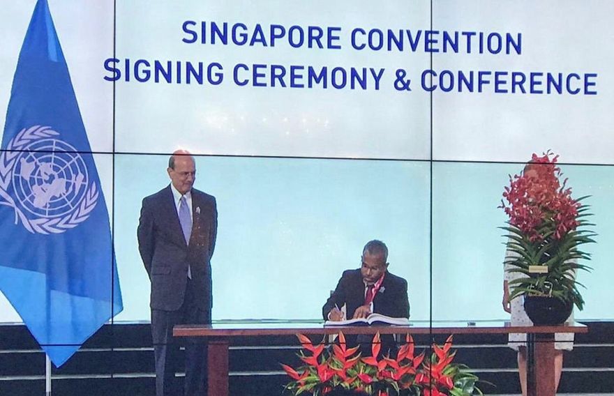 ޔުނައިޓެޑް ނޭޝަނަސް ކޮންވެންޝަން އޮން އިންޓަނޭޝަނަލް ސެޓްލްމަންޓް އެގްރީމަންޓްސް ރިޒަލްޓިން ފްރޮމް މީޑިއޭޝަން (ސިންގަޕޯ ކޮންވެންޝަން އޮން މީޑިއޭޝަން) ގައި ރާއްޖެއިން މިއަދު ސޮއިކުރީ އެ މުއާހަދާގައި ސޮއި ކުރުމަށް ސިންގަޕޫރުގައި މިހާރު ކުރިއަށް ގެންދާ ރަސްމިއްޔާތެއްގަ އެވެ. ރާއްޖޭގެ ފަރާތުން އެ މުއާހަދާގައި ސޮއިކުރެއްވީ ބަންޑާރަ ނައިބު އިބްރާހިމް ރިފްއަތެވެ.