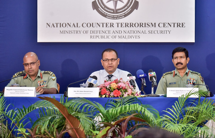 ނޭޝަނަލް ކައުންޓަ ޓެރެރިޒަމް ސެންޓަރުން ކުރަމުން އަންނަ މަސައްކަތްތަކާ ބެހޭ ގޮތުން ނޫސްވެރިންނާ ވާހަކަ ދައްކަވަމުން މިނިސްޓަރު ވިދާޅުވީ ޖިހާދަށް ދިއުމަށް ފުރަން އުޅެނިކޮށް ހައްޔަރުކޮށްފައި ވަނީ ދެކުނުގެ ރަށަކަށް ނިސްބަތްވާ ދެ މީހަކު ކަމަށެވެ.