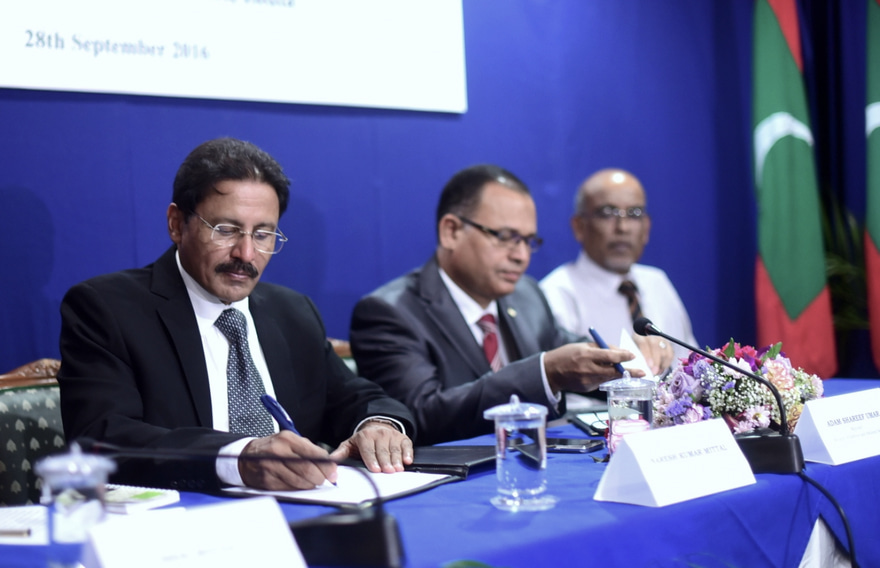 ކޯސްޓްގާޑު ބިލްޑިންގްގައި ބޭއްވި ރަސްމިއްޔާތެއްގައި އެއްބަސްވުމުގައި ސޮއިކުރެއްވީ ރާއްޖޭގެ ޑިފެންސް މިނިސްޓަރު އާދަމް ޝަރީފާއި ލަވްލީ ޔުނިވަސިޓީގެ ވައިސް ޗެއާމަން ނަރޭޝް ކުމާރު މިއްޓަލް އެވެ.