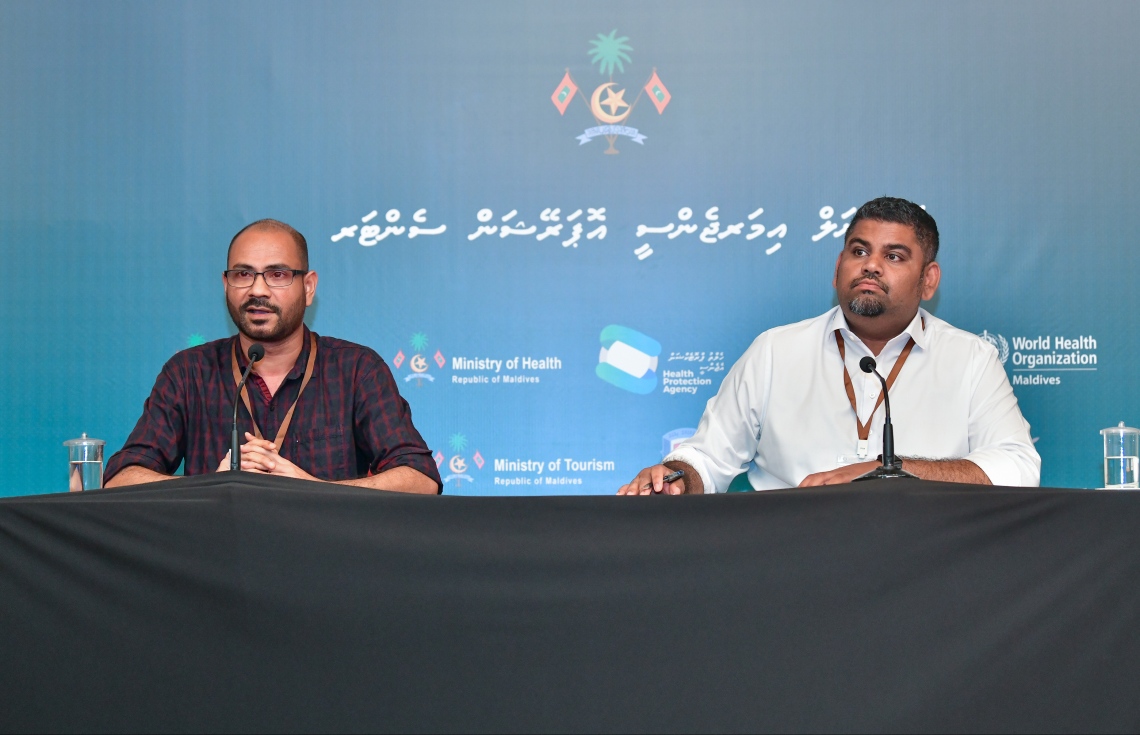 ނެޝަނަލް އިމަޖެންސީ އޮޕަަރޭޝަން ސެންޓަރުން މިރޭ ބޭއްވި ޕްރެސް ކޮންފަރެންސްގައި ތަރުޖަމާން މަބްރޫކް އަބްދުލް އަޒީޒް އަދި އައިޖީއެމްްއެޗްގެ ޑޮކްޓަރު، ޑރ. އަފްޒަލް ވާހަކަ ދައްކަވަނީ. --ފޮޓޯ:ނިޝާން އަލީ/މިހާރު