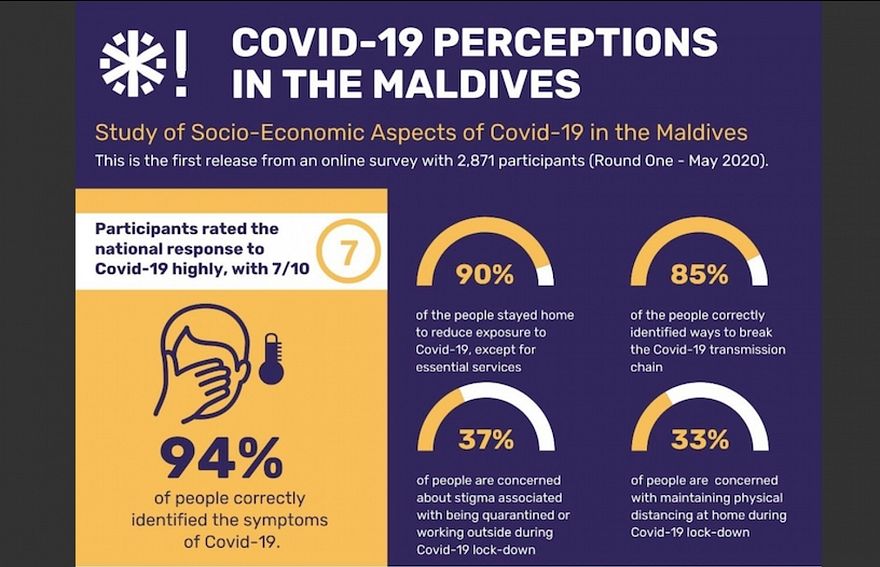 ކޮވިޑް-19ގެ ސަބަބުން އިޖުތިމާއީ އަދި އިގްތިސާދީ ކަންކަމަށް ކުރި އަސަރުތައް ދެނެގަތުމަށް ކުރާ ސާވޭގެ ފުރަތަމަ ބުރުގައި މިދިޔަ މަހު 2،871 މީހަކާ ސުވާލުކޮށްގެ އެއްކުރި މައުލޫމާތުން ހާމަވި ގޮތުގައި ކޮވިޑް-19 ގެ އަލާމާތްތަކަކީ ކޮބައިކަން ރަނގަޅަށް ބުނެދޭން އެނގޭ މީހުންގެ ނިސްބަތް ހުރީ 94 ޕަސެންޓުގަ އެވެ. އަދި ކޮވިޑް-19 ފެތުރެން ފެށުމުން ސަރުކާރުން އަޅަމުން އަންނަ ފިޔަވަޅުތައް މި ސާވޭގެ ބައިވެރިން ރޭޓްކޮށްފައިވަނީ 10 އިން 7 ގަ އެވެ.