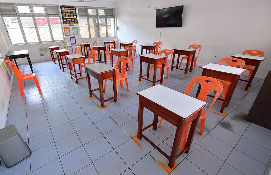 އެ ސްކޫލުގައި ދަރިވަރުންގެ މޭޒުތައް ދުރުގައި ބެހެއްޓުމަށްފަހު، އެ ކޮންމެ މޭޒެއް ވެސް ވަކިކުރަން މުށިތަކުގައި ޓޭޕް ދަމާފައިވެ އެވެ. ސްކޫލުގެ ގޯތިތެރޭގައި އަތްދޮންނަ ތަށިތައް ބަހައްޓައި ގައިދުކުރުކަން ބެހެއްޓުމަށް ހަނދާންކޮށް ސްޓިކާތައް ހަރުކޮށްފައިވެ އެވެ.
