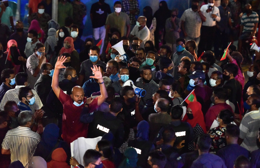 ކޮވިޑް-19 އިން ރައްކާތެރިވުމުގެ ގޮތުން އެއްވެ އުޅުން މަނާކޮށްފައިވަނިކޮށް އިދިކޮޅު ފަރާތްތަކުން ބާއްވާ މުޒާހަރާތަކުގައި އެއްވުމުގެ ބައިވެރިން މާސްކް އަޅައިގެން ތިއްބަސް އެއްވެސް ވަރަކަށް ގައިދުރު ކަމެއް ނުބަހައްޓަ އެވެ. އަދި ފުލުހުންނާ ކުރިމަތިލުން ހިނގާއިރު ބޮނޑިވެގެން އެއްވެ އުޅެ އެވެ.