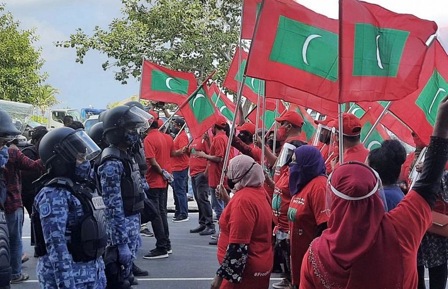 އިިދިކޮޅުން މިއަދު ބާއްވަން އުޅުނު އެއްވުމަށް ފުލުހުން ހުރަސް އެޅީ، ކޮވިޑްގެ ހާލަތު މާލޭގައި ގޯސްވަމުން ދާތީ ދިހަ މީހުންނަށް ވުރެ ގިނައިން މީހުން މަގުމައްޗަށް އެއްވެ އުޅުން މަނާކޮށް، ހެލްތު ޕްރޮޓެކްޝަން އެޖެންސީން އުސޫލެއް ނެރެފައިވާތީ އެވެ. އެއްވުން ނުބޭއްވުމަށް ފުލުހުން އިލްތިމާސް ކުރި ނަމަވެސް، އިދިކޮޅުން ވަނީ އެކަމަށް ބެލުމެއް ނެތި، މުޒާހަރާކުރަން ނިންމާފަ އެވެ. އެހެންވެ މުޒާހަރާ ފެށުމުގެ ކުރިން، އިދިކޮޅުގެ ގިނަ ބަޔަކު ފުލުހުންގެ ބެލުމުގެ ދަށަށް ގެންދިޔަ އެވެ.