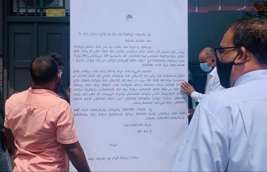އިދިކޮޅުން ރައީސްގެ އަރިހަން ގެންދަން އުޅުނު ބޮޑު ސިޓީ އޮތީ ޕްރިންޓްކޮށް ބޮޑު ފިލައެއްގައި ތަތްކޮށްފަ އެވެ. އެ ބޯޑު ގެންދިއުން ފުލުހުން ހުއްޓުވީ ހ. ހުރަފާގައި ހުންނަ ޕީޕީއެމް/ޕީއެންސީ އޮފީހުން އެ ހިފައިގެން ނުކުމެގެން، މަޖީދިއްޔާ ސްކޫލާ ހަަމައަށް ދިޔަ ފަހުންނެވެ.