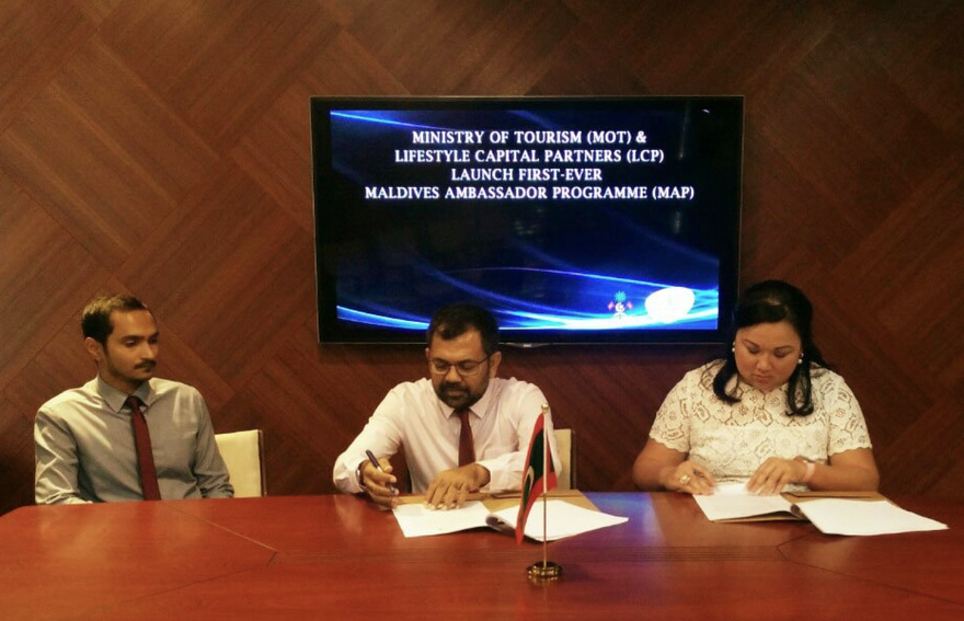 މޯލްޑިވްސް އެމްބެސެޑަރު ޕްރޮގްރާމް ފެށުމަށް އެކަމާ ބެހޭ އެއްބަސްވުމެއްގައި ޓޫރިޒަމް މިނިސްޓްރީ އާއި ހޮން ކޮންގުގެ ކުންފުންޏެއް ކަމަށްވާ ލައިފްސްޓައިލް ކެޕިޓަލް ޕާޓްނާސް (އެލްސީޕީ)އާ އެކު މިއަދު ވަނީ ސޮއިކޮށްފަ އެވެ. ޓޫރިޒަމް މިނިސްޓްރީގައި ބޭއްވި ރަސްމިއްޔާތެއްގައި މިނިސްޓަރު އެ އެއްބަސްވުމުގައި ސޮއިކުރެއްވީ މިނިސްޓަރު މޫސާ ޒަމީރާއި ލައިފްސްޓައިލް ކެޕިޓަލްގެ ވެރިޔާ ލިން ވިލަޑޮއިޑެވެ.