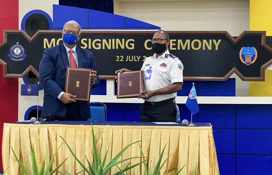 "އެކްސްޗޭންޖް އޮފް ޕްރީ އެރައިވަލް އިިންފޮމޭޝަން ފޯ ފެސިލިޓޭޝަން އޮފް ޓްރޭޑް އެންޑް ކަސްޓަމްސް ކޮންޓްރޯލް އޮން ގުޑްސް" ގެ އެމްއޯޔޫގައި ރާއްޖޭގެ ފަރާތުން ސޮއިކުރެއްވީ ކޮމިޝަނާ ޖެނެރަލް އޮފް ކަސްޓަމްސް އަބްދުﷲ ޝަރީފެވެ. އިންޑިއާގެ ފަރާތުން އެ އެމްއޯޔޫގައި ސޮއިކުރެއްވީ އިއްޔެ ރާއްޖެ ވަޑައިގެން އުޅުއްވާ، ސެންޓްރަލް ބޯޑް އޮފް އިންޑައިރެކްޓް ޓެކްސަސް އެންޑް ކަސްޓަމްސްގެ ޗެއާމަން އަޖިތު ކުމާރެވެ.