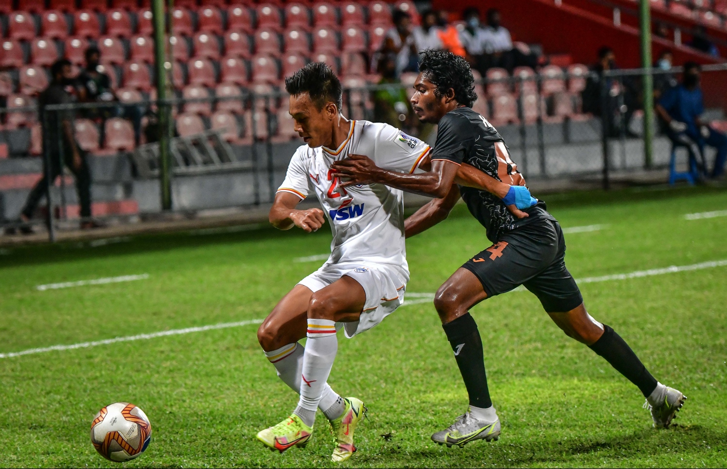 ގައުމީ ފުޓްބޯޅަ ދަނޑުގައި މިރޭ ކުޅުނު މެޗުގެ 13 ވަނަ މިނެޓުގައި ސުނިލް ޗެތުރީ އޭރއާގެ އަރިމަތިން ނެގި ބޯޅަ ކްލައިޓޮން އޯގަސްޓޯ ވެއްޓިގެންފައި ފޮނުވާލި ބޯޅަ ދިޔައީ ހުރަސް ދަނޑިމަތިން ބޭރަށެވެ. އޭގެ އެއް މިނެޓް ފަހުން މުހައްމަދު ނާއީމް، އީސްމާއީލް އީސާ އަށް ތަނަވަސްކޮށްދިން ފުރުސަތުގައި ނުރައްކާ ކުރަން އީސަ އަށް ފުރުސަތު ލިބުނު ނަމަވެސް ބެންގަލުރޫގެ މުހައްމަދު އާޝިގީ ކުންޔާން ވަނީ އީސާގެ ފަހަތުގައި ހުރެފައި ބޯޅަ ކޯނަރަކަށް ބޭރުކޮށްލައިފަ އެވެ.