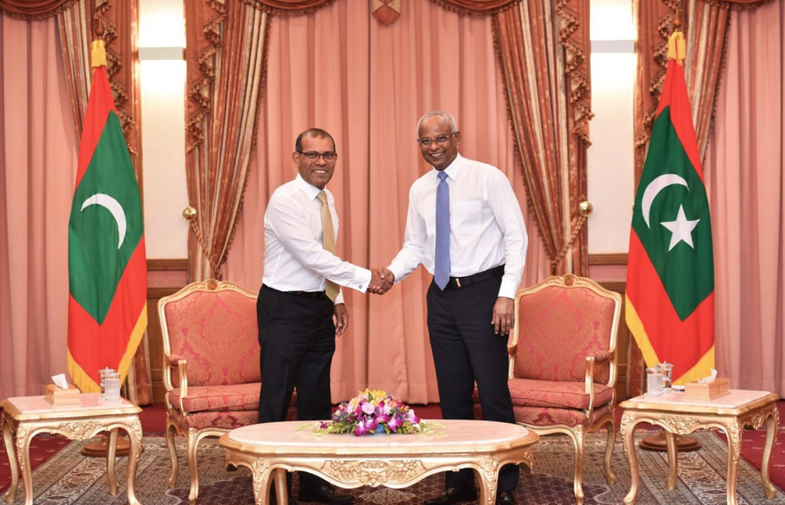 ބޮޑެތި ހިޔާލުތަފާތުވުންތަކުގައި ގުޅުން ގޯސްވެ އެކުގައި ސިޔާސީ މަސައްކަތް ނުކުރައްވާނެ ކަން ރައްޔިތުންގެ މަޖިލީހުގެ ރައީސް މުހައްމަދު ނަޝީދު އިއުލާނު ކުރެއްވި ފަހުން، ފުރަތަމަ ފަހަރަށް އެ މަނިކުފާނު ރައީސް އިބްރާހިމް މުހައްމަދު ސޯލިހުއާ މިއަދު ބައްދަލުކުރައްވައިފި އެވެ.