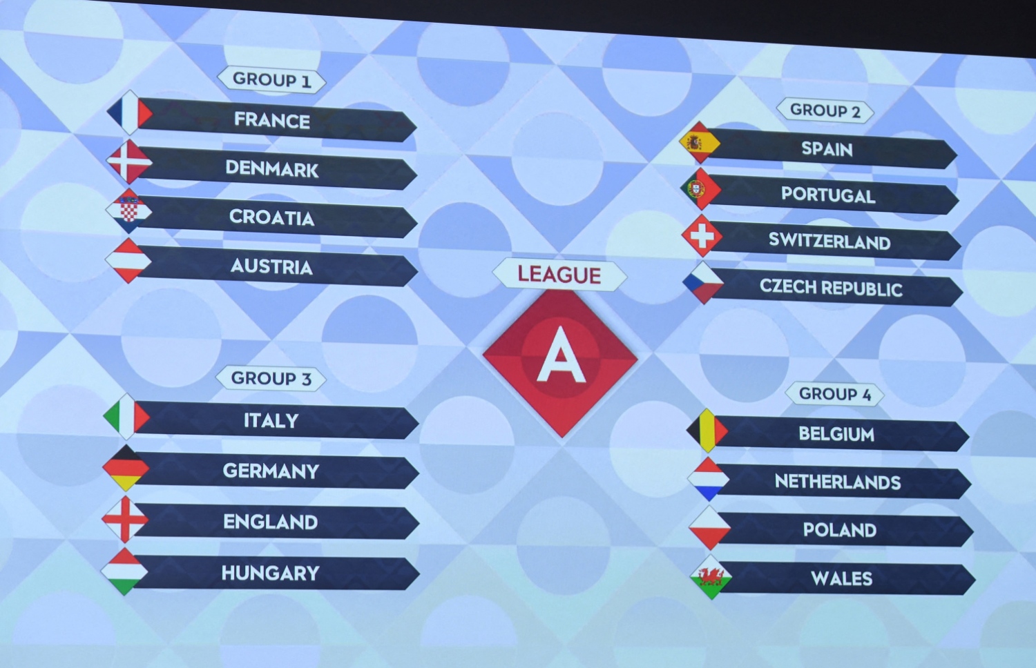 އެންމެ ފަހުގެ ނޭޝަންސް ލީގު ޗެމްޕިއަން ފްރާންސް ހިމެނުނީ ޑެންމާކާއި ކްރޮއޭޝިއާ އަދި އޮސްޓްރިއާ އާއެކު ގުރޫޕް އެކެއްގަ އެވެ.