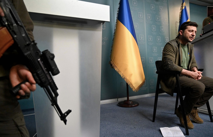 ރަޝިޔާ އިން ހަނގުރާމަ ފެށުމާ އެކު، ޒެލެންސްކީ، 44، ވަނީ ގައުމު ދޫކޮށް ވަޑައިގަތުމަށް ދެކޮޅު ހައްދަވައިފަ އެވެ. އަދި ކުރީގެ ކޮމެޑީ ބަތަލް ވަނީ ރަޝިޔާއާ ދެކޮޅަށް ވަރުގަދަ ބަހުގެ ހަމަލާތައް ދެއްވައި އޭނާ ހުންނަވާނީ ރައްޔިތުންނާ އެކު ކަމަށް ވިދާޅުވެ މަގުތަކަށް ނުކުންނަވައިގެން އުޅޭ މަންޒަރުތައް ވެސް ޓްވީޓްކުރައްވައިފަ އެވެ. ޒެލެންސްކީ ވިދާޅުވެފައި ވަނީ ރަޝިޔާގެ ހަމަލާތަކުގެ އެއްވަނަ އަމާޒަކީ އޭނާ ކަމަށެވެ.