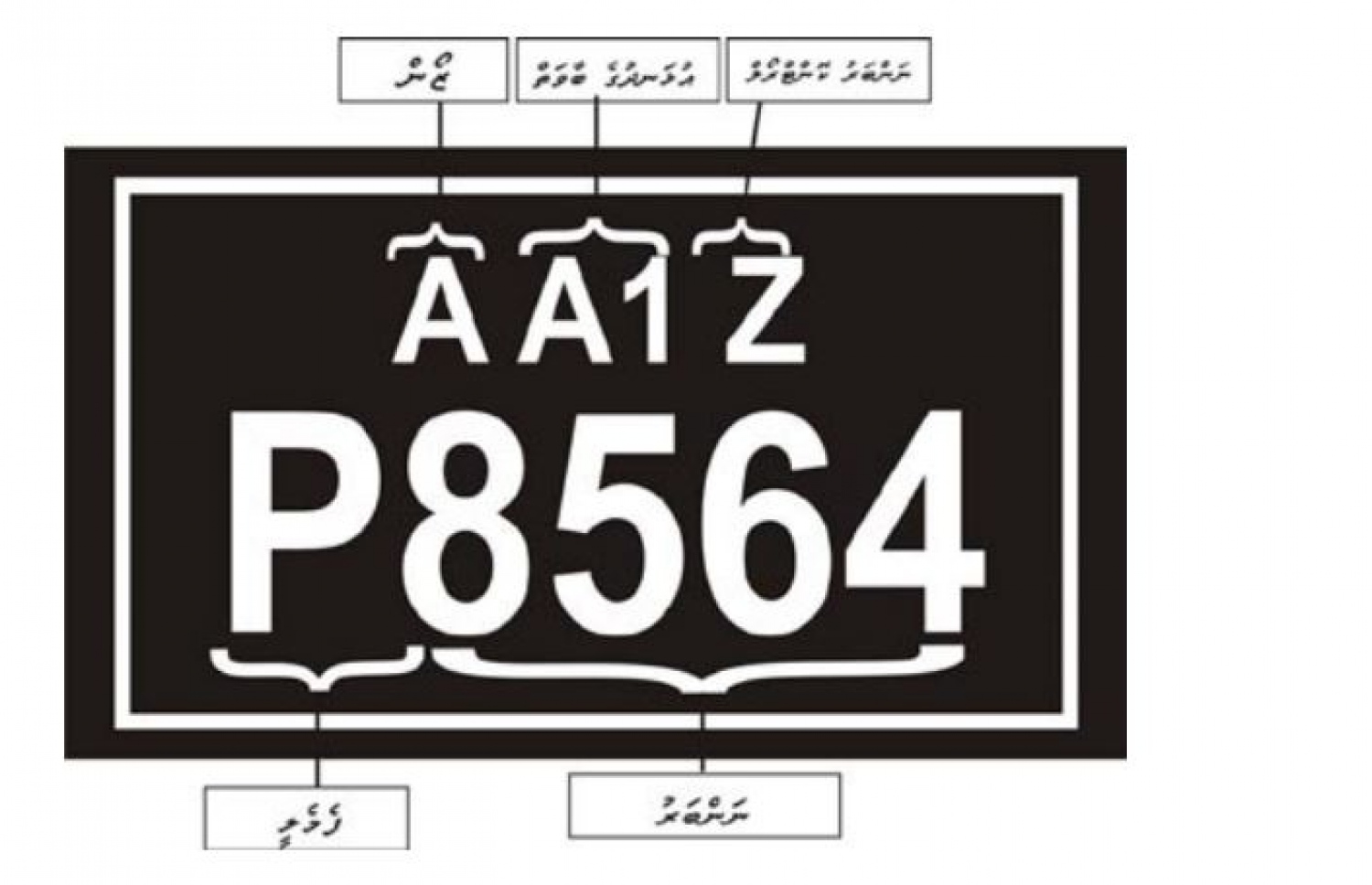 ވިޔަފާރި އުސޫލުން ބޭނުންކުރާ އުޅަނދުތަކުގެ ނަންބަރު ބޯޑުތައް ހުންނަން ވާނީ ރީނދޫ ކުލައިގެ ބޯޑެއްގައި ކަޅުކުލައިގެ އަކުރުންނެވެ. އަދި ކޮންސިއުލާ މިޝަންތަކުގައި ބޭނުންކުރާ އުޅަނދުތަކުގެ ނަންބަރު ބޯޑު ހުންނަން ވާނީ ނޫ ކުލައިގެ ބޯޑެއްގައި ހުދު ކުލައިގެ އަކުރުން ލިޔެފަ އެވެ. އެ ނޫން އުޅަނދުތަކުގެ ނަންބަރު ބޯޑު ހުންނަން ވާނީ ކަޅު ކުލައިގެ ބޯޑެއްގައި ހުދު ކުލައިގެ އަކުރުން ލިޔެފަ އެވެ.