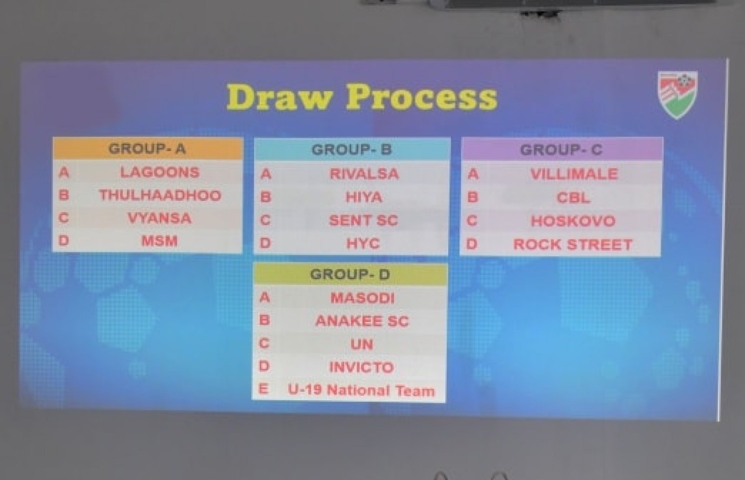 ގުރޫޕް ޑީ: މަސްއޮޑި ސްޕޯޓްސް ކްލަބް، އަނާކީ ސްޕޯޓްސް ކްލަބް، ޔޫއެން ފްރެންޑްސް، އިންވިކްޓޯ ސްޕޯޓްސް ކްލަބް، 19 އަހަރުން ދަށުގެ ގައުމީ ޓީމް