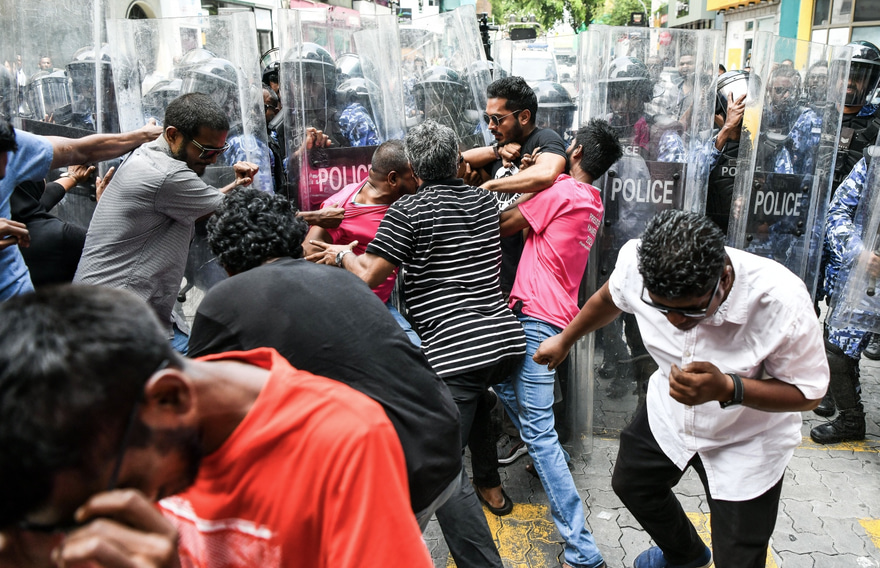 އެ ނޫސްވެރިޔާ ވެއްޓުނީ ފުލުހުން މުޒާހަރާ ރޫޅާލުމަށް ޝީލްޑްތަކާއެކު ކުރިޔަށް ޖެހެމުން ދިޔައިރު އެއްވުމުގެ ބައިވެރިން ނޫސްވެރިންގެ ގައިގައި އަޅައި ކޮއްޕުމާއި ނޫސްވެރިން ޝީލްޑް ތަކުގައި އަޅައި ކޮއްޕުން ފަދަ ކަންކަމުގެ ތެރެއިން ކަމަށް ފުލުހުން ބުންޏެވެ.