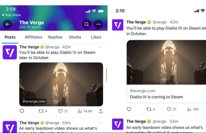 އެކްސްގައި އާޓިކަލްއެއް ޕޯސްޓްކުރުމުން މިހާރު ފެންނާނީ ޕްރިވިއު އިމޭޖާާ އެކު އެ އިމޭޖު މަތީގައި ވެބްސައިޓްގެ އެޑްރެސް އެވެ. އިމޭޖްގެ ތިރިން ފެންނަ ހެޑްލައިން ނުވަތަ ޔޫއާރްއެލް މިހާރު ނުފެންނާނެ އެވެ.