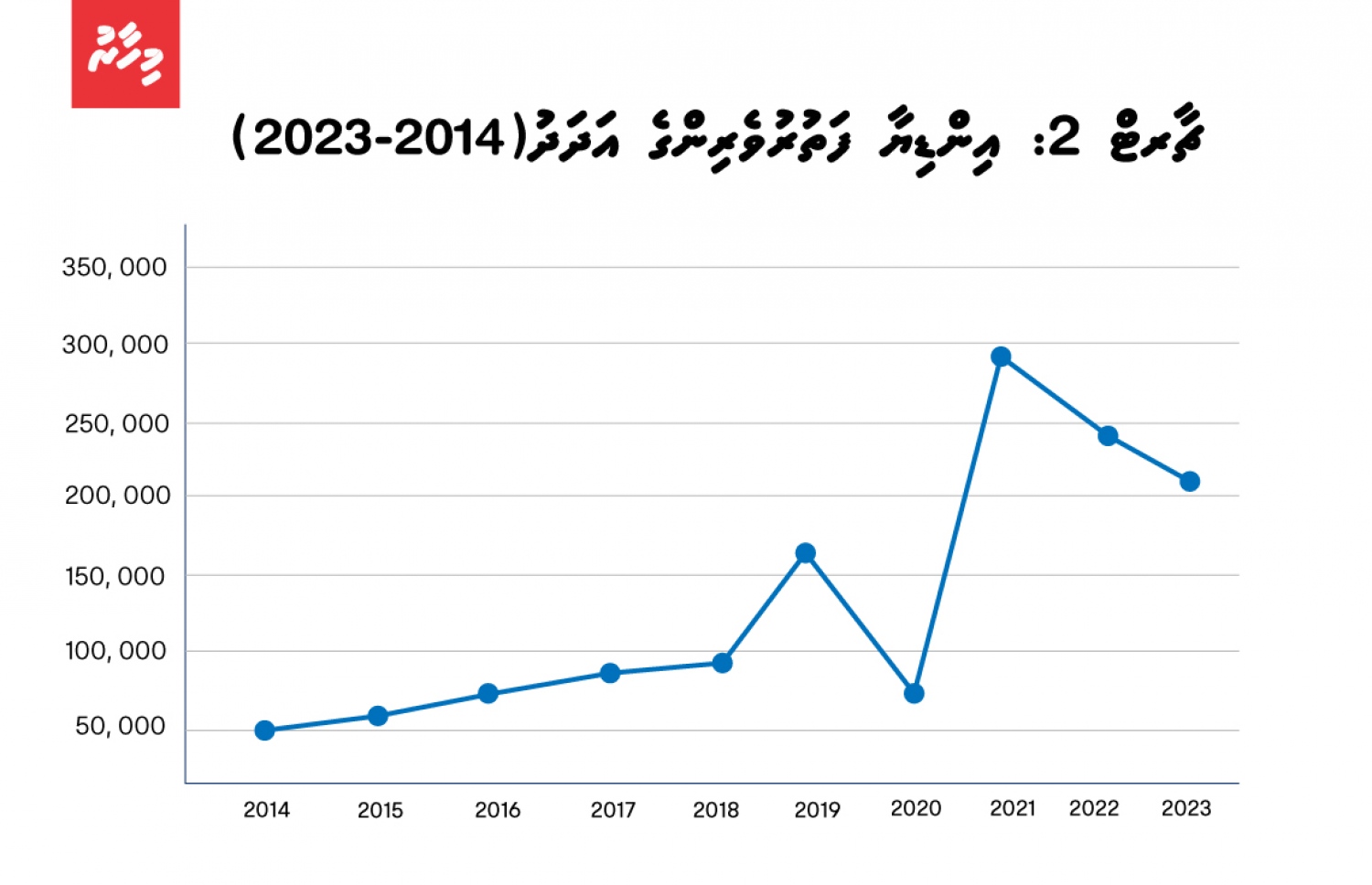 ވޭތުވެދިޔަ 10 އަހަރު (2104-2023) ގެ ތެރޭގައި އިންޑިޔާ ޓޫރިސްޓުން ރާއްޖެ އަށް ޒިޔާރަތް ކުރި އަދަދުތަކަށް ވިސްނާލުމުން، (ޗާޓް 2) ދެތިން ކަމެއް ފާހަގަކުރެވެއެވެ.