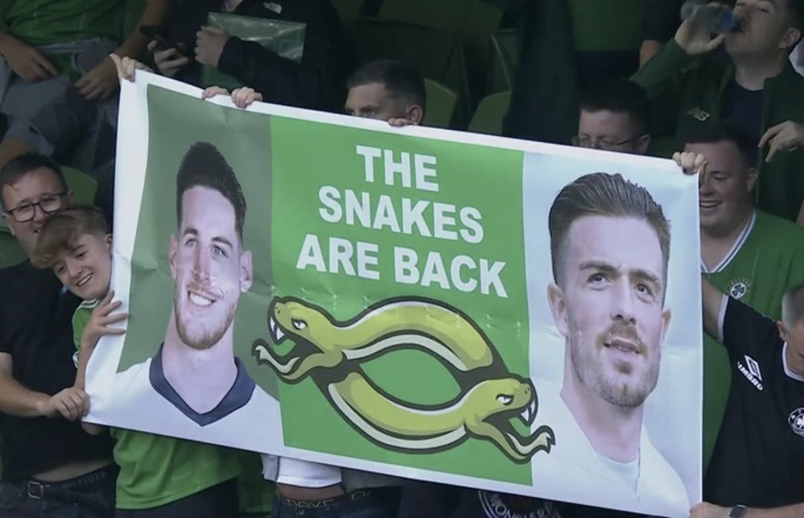 އިންގްލެންޑަށް އުފަން ރައިސް، 25، އާއި ގްރީލިޝް، 28، ގެ ފޮޓޯ އާއެކު، "ހަރުފަތައް އެނބުރި އަތުވެއްޖެ" ލިޔެފައިވާ ޕޯސްޓަރެއް ރޭގެ މެޗުގައި ރިޕަބްލިކް އޮފް އަޔަލެންޑްގެ ސަޕޯޓަރުން ސްޓޭޑިއަމްގައި ގެންގުޅުނެވެ.