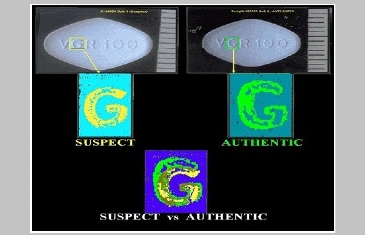 މިއީ ޖިންސީ ބަލިކަށިކަން ހުންނަ މީހުން، އާއްމުކޮށް ބޭނުންކުރާ ބޭހެއް ކަމުގައިވާ ސިލްޑަނަފިލް ކިޔާ ބޭހެއްގެ އަސްލު ވައްތަރު ދެނެގަތުމަށްޓަކައި އެމެރިކާގެ ފުޑް އެންޑް ޑްރަގް އެޑްމިނިސްޓްރޭޝަނުން ކޮށްފައިވާ މަސައްކަތެކެވެ. ބަލާބެލުމަށް މި ދެބޭސްގުޅައިން އެއްވެސް ތަފާތެއް ނުފެނެ އެވެ. އެތައް ފަހަރަކު އެތައް ވަރަކަށް އެންލާޖް ކޮށްގެން ނުވަތަ ބޮޑުކޮށްގެން ބެލުމުން ވެސް އެއްވެސް ތަފާތެއް ފާހަގައެއް ނުކުރެވެ އެވެ. ދެން އެއަށް ފަހު އެއް ބޭހުގެ ފޮޓޯ މައްޗަށް އަނެއް ބޭހުގެ ފޮޓޯލައި ބެލުމުން، އަކުރެއްގެ ތަފާތު ފާހަގަވެގެން ދިޔަ އެވެ. މަތީގައިވާ ފޮޓޯއިން އެ ފެންނަ "ޖީ" އަކުރަކީ މި ދެންނެވި ތަފާތުވި އަކުރެވެ. ފަހަރުގައި ރަހުމަތްތެރިޔާ އެ ބުނާ ބާޒާރުމަތިން ލިބޭ ބޭހަކީ މިފަދަ ބާވަތުގެ ބޭސް ކަމުގައި ވެސް ވުން އެކަށީގެންވެ އެވެ. އާއްމުކޮށް މިފަދަ ބޭސް ބައެއް މީހުން ގަންނަނީ އިންޓަނެޓް މެދުވެރިކޮށެވެ.