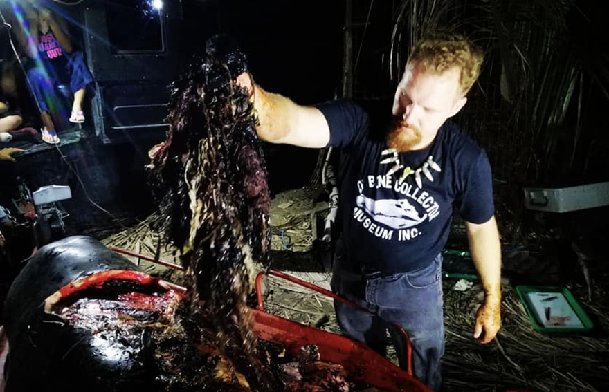 މަރުވެގެން ލެއްގި ބޮޑުމަސް އެ ގައުމުގެ ޑި ބޯން ކަލެކްޓާ މިއުޒިއަމްގެ އޮފިޝަލުން ނަގައި ފެޅި އިރު، ބަނޑުތެރޭގައި ނެތް ވައްތަރެއްގެ ޕްލާސްޓިކެއް ނެތެވެ. އޭގެ ތެރޭގައި ބާޒާރު ކޮތަޅާއި ހަނޑޫ ބަންދުކުރާ ކަހަލަ ސުތުލި ގޯންޏާއި އަދި އެ ނޫން ވެސް އެހެން ބާވަތުގެ ޕްލާސްޓިކް ހިމެނެ އެވެ. އެ ތަކެތި ނަގައި ބަރުދަން ބެލި އިރު 40 ކިލޯ އަށް އަރަ އެވެ.