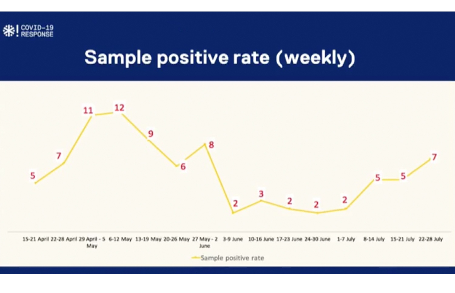 ކޮވިޑަށް ޓެސްޓުކުރަން ނަގާ ސާމްޕަލްތަކުގެ ތެރެއިން ހަފްތާއަކު ޕޮޒިޓިވްވާ ނިސްބަތް ޖޫން މަހު އަދި ޖުލައި ކުރީކޮޅު 2-3 ޕަސެންޓުގައި ހުރެފައި މަތިވަމުން ގޮސް މިދިޔަ މަހުގެ ފަހު ހަފްތާގައި ވަނީ ހަތް ޕަސެންޓަށް އަރައިފަ އެވެ. ބަލި ކޮންޓްރޯލްވެފައިވާ ނަމަ އެ ނިސްބަތް ހުންނާނީ، ޑަބްލިޔުއެޗްއޯގެ މިންގަނޑު ބުނާ ގޮތުން، (ޝައްކުކުރެވޭ ކޭސްތައް ހޯދައި ޓެސްޓުކުރުން ރަނގަޅު ހާލަތުގައި) ފަސް ޕަސެންޓަށް ވުރެ ދަށުގަ އެވެ.