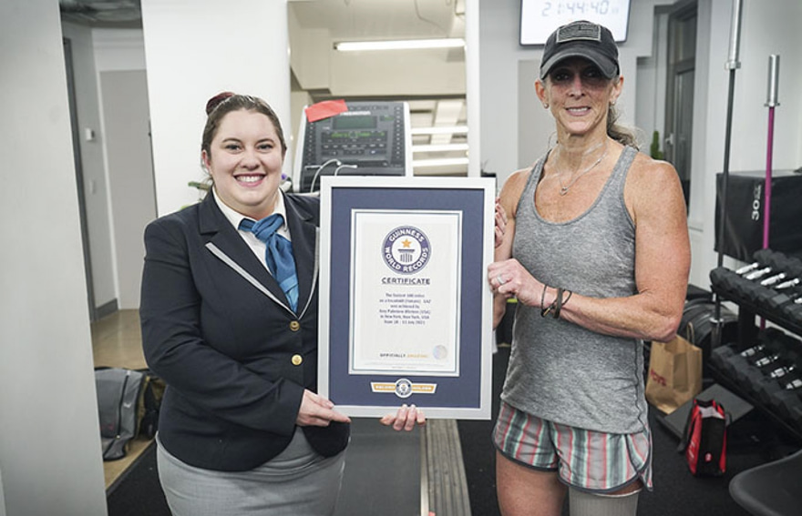މަސްނޫއީ ފައެއް ޖަހާފައިވާ މީހަކު، ޓްރެޑްމިލްގައި ދުވެގެން މިހާތަނަށް އެންމެ އަވަހަށް 100 މޭލު ކަނޑައްތުކުރި އަންހެނާގެ ރެކޯޑް އެމެރިކާގެ މީހަކަށް ލިބިއްޖެ އެވެ.