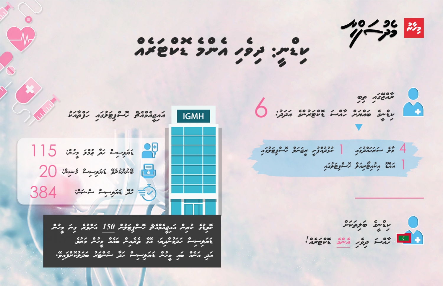 ރާއްޖޭގައި ކެންސަރަށް ފަރުވާ ހޯދާ 2000 އަށް ވުރެ ގިނަ މީހުން، އަދި ކިޑްނީ ފެއިލްވެގެން ޑައިލަސިސް ހަދާ 257 މީހުން އެބަ ތިއްބެވެ. އެ މީހުންގެ ތެރެއިން އެކި ރަށްރަށުގައި ދިރިއުޅޭ މީހުން ފަރުވާ ހޯދަން ޖެހެނީ ރަށުގައި ބިނާކުރި ދިރިއުޅުން މުލުން އުފުރާލައިގެން ހަރަދު ބޮޑު މާލެއަށް ބަދަލުވާށެވެ. އަދި ފަރުވާގެ ކޮންމެ ވެސް މަރުހަލާއެއްގައި ރާއްޖެއިން ބޭރަށް ދަތުރު ނުކޮށް ވާނެ ގޮތެއް އެ މީހުންނަކަށް ނޯވެ އެވެ.