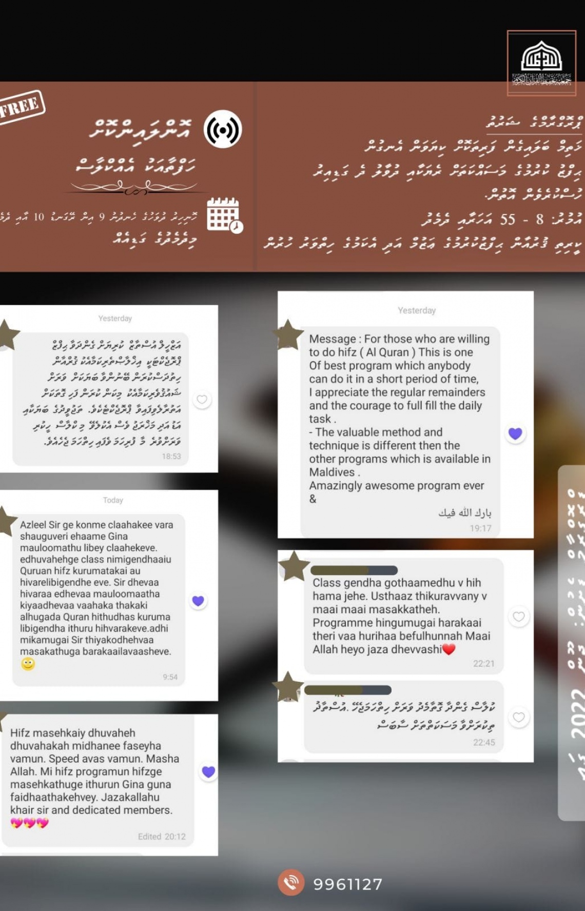 "ގުރުއާން ހިތުދަސްކުރަން ބައެއް މީހުންނަށް އަހަރުތައް އެބަ ހޭދަވޭ. އެކަމަކު މި މެތަޑުގެ ކާމިޔަބުކަމަކީ ކުދިންނަށް 4-6 ފަސް ސަފުހާ އެބަ ދުވާލަކު ދަސްވޭ. އޭރުން އަށް މަހުން ގުރުއާން ދަސްވާނެ. މިހާރު މުޅި ގުރުއާން ހިތުދަސްކޮށް ނިމެން ކައިރިވެފައިވާ ކުދިން އެބަ ތިބި،" އޭނާ ވިދާޅުވި އެވެ.