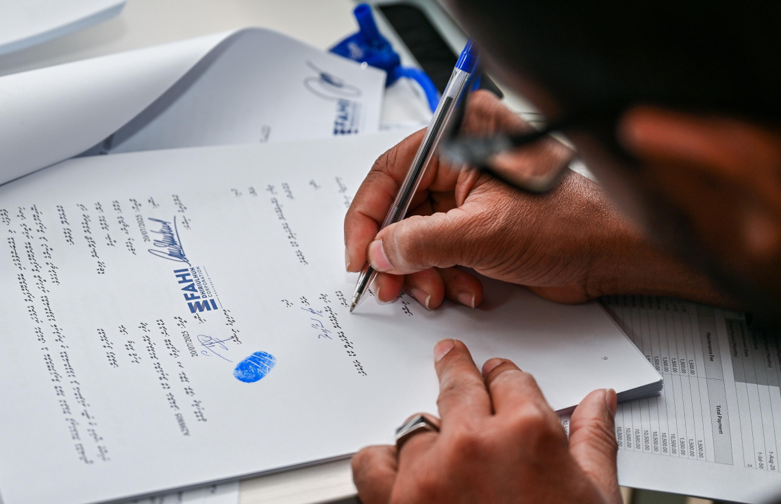 ފްލެޓް އެއްބަސްވުމެއްގައި މީހަކު ސޮއިކުރަނީ.-- ފޮޓޯ: ފަޔާޒު މޫސާ | މިހާރު