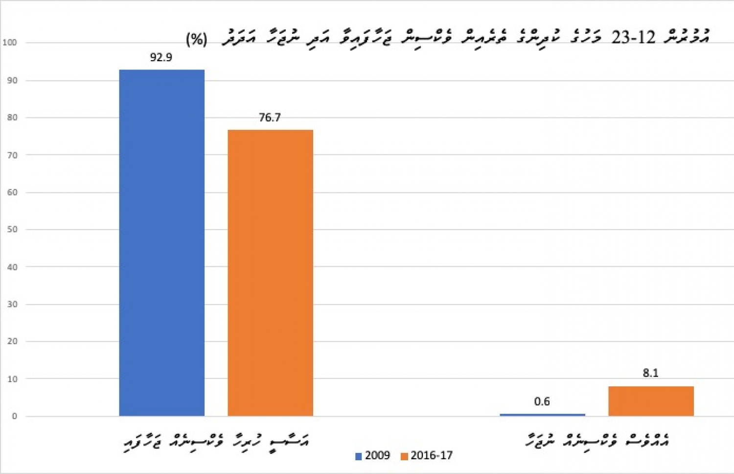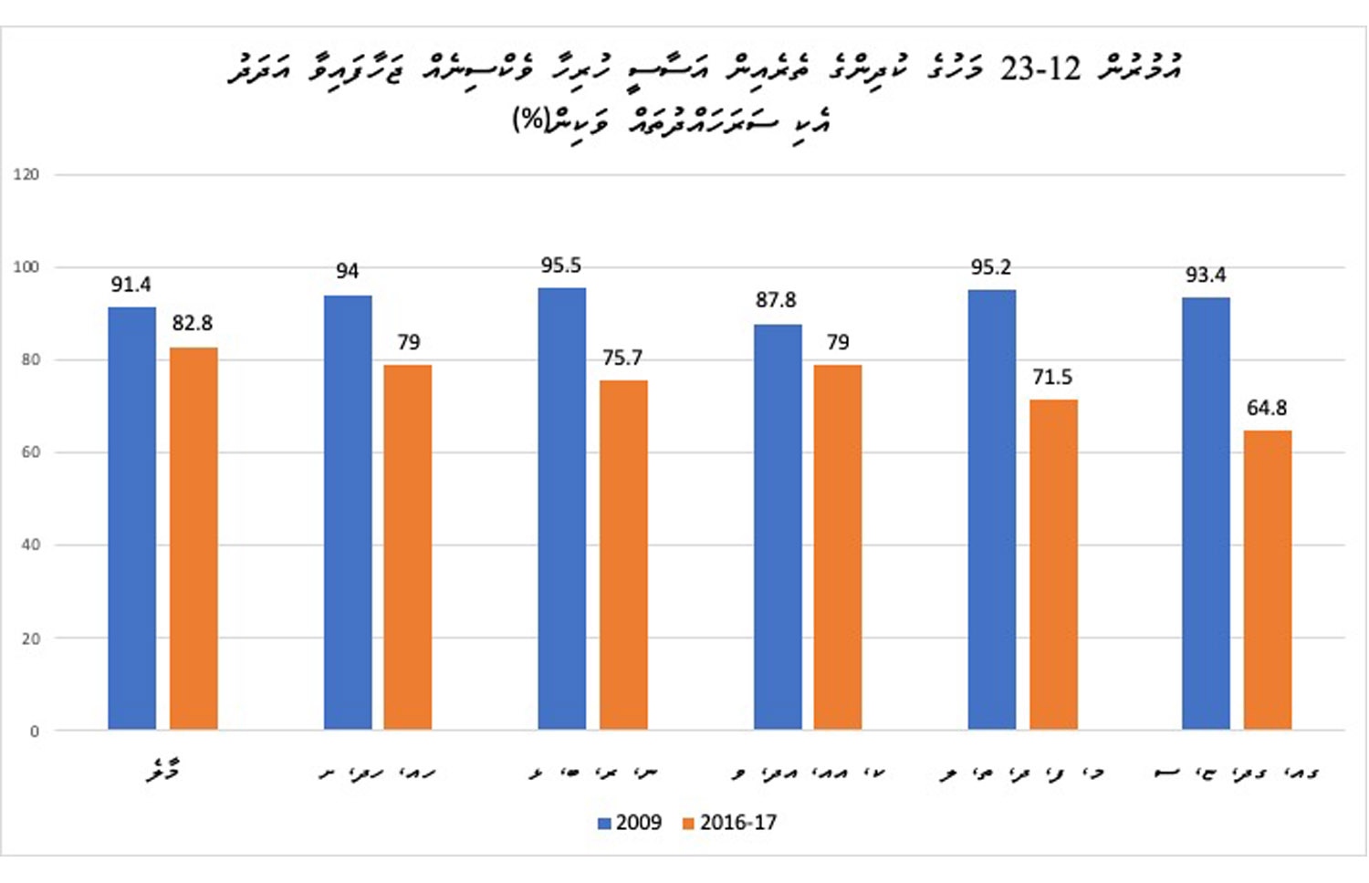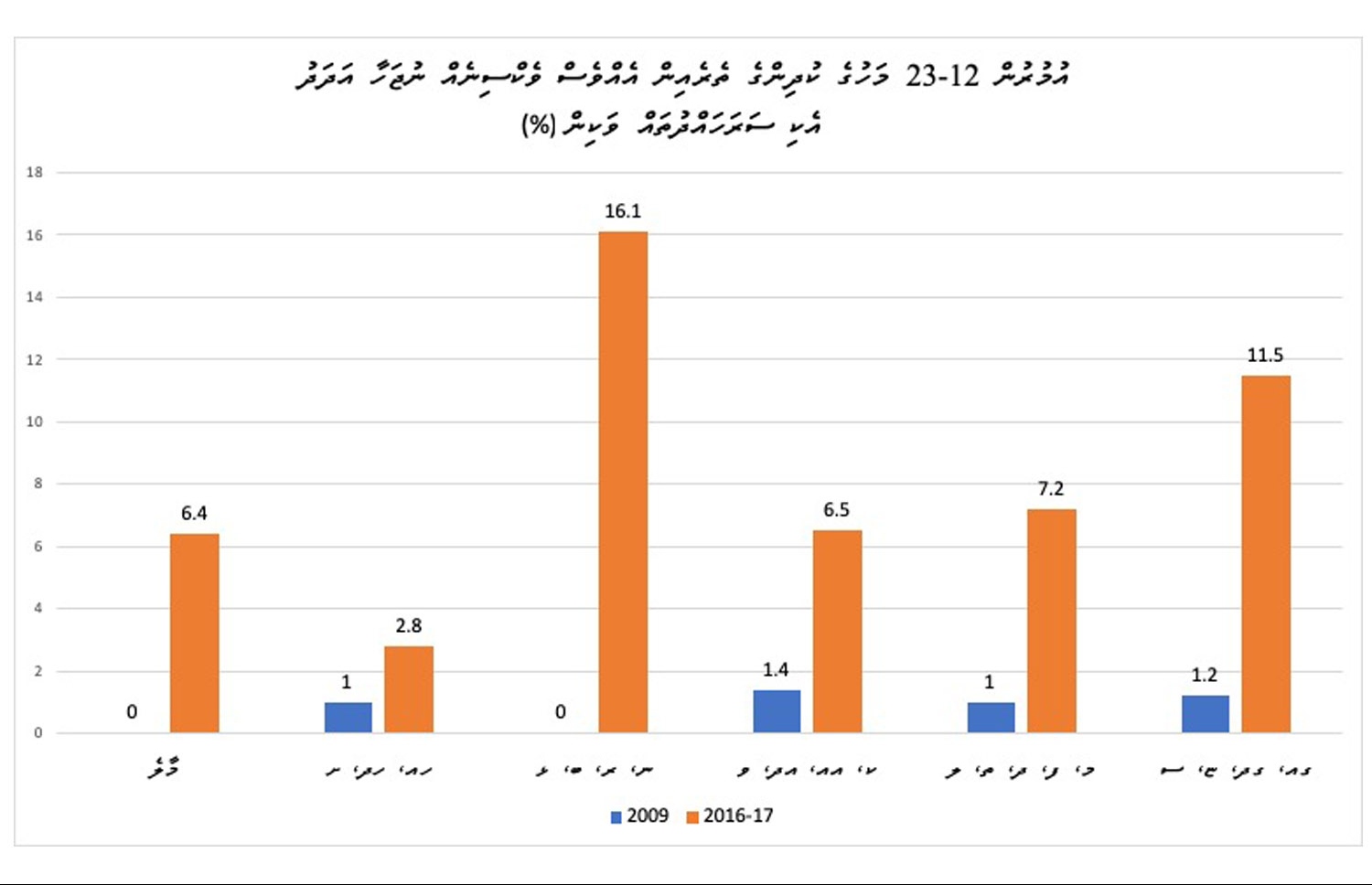 ވެކްސިން ޖަހަން ޖެހޭ އުމުރުގައި ވެކްސިން ފުރިހަމަކޮށްފައިވާ 1-2 އަހަރުގެ ކުދިންގެ އަދަދު 2016-17ގައި ހުރީ 76 ޕަސެންޓުގަ އެވެ. އަދި އުމުރުން 2-3 އަހަރުގެ ކުދިންގެ ތެރެއިން އުމުރާ ގުޅޭ ގޮތަށް ވެކްސިން ފުރިހަމަކޮށްފައިވާ ނިސްބަތަކީ 65 ޕަސެންޓެވެ.
