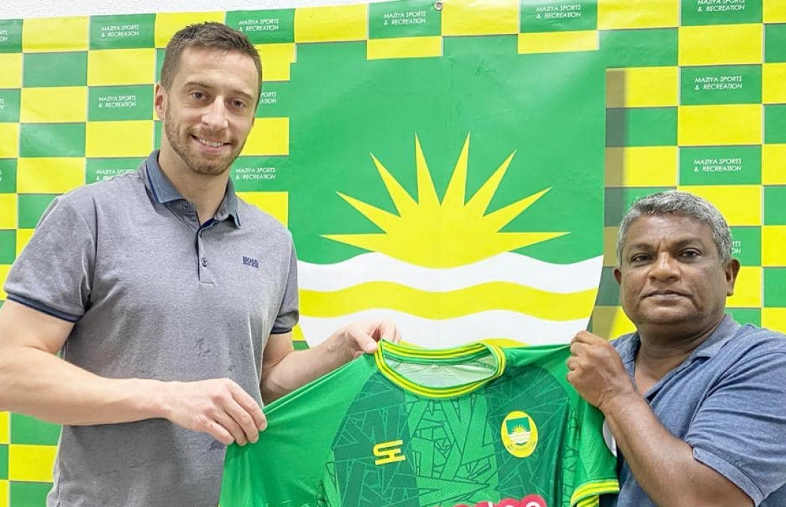 މާޒިޔާގެ ޗެއާމަން އަހްމަދު ސާޖިދު (ކ) އާއި އެޓީމަށް އަލަށް ސޮއިކުރުވި ޑިފެންޑަރު ކާޓަލް މާޒިޔާގެ ޖޯޒޯ ހިފަހައްޓާލައިގެން --- ފޮޓޯ: މާޒިޔާ