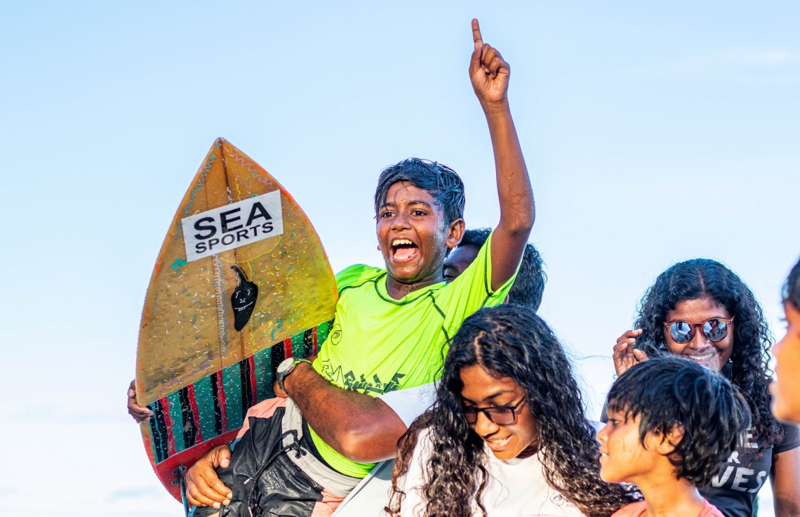 ގައުމީ ޖޫނިއާ ޗެމްޕިއަންޝިޕް ގައި 16 އަހަރުން ދަށުގެ ފައިނަލް ހީޓް ކާމިޔާބު ކުރުމަށް ފަހު އެއްގަމަށް އެރުމުން ޔަސީންގެ ބައްޕަ އޭނާ އުރާލަނީ.-- ފޮޓޯ: އެމްއެސްއޭ