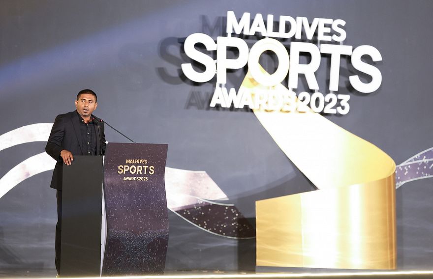 މަހްލޫފް މިހެން ވިދާޅުވީ ރޭ އެކުވެނި ސިންތެޓިކް ޓްރެކް ސަރަހައްދުގައި ކުލަގަދަކޮށް ބޭއްވުނު މޯލްޑިވްސް ސްޕޯޓްސް އެވޯޑްސް ހަފްލާގައި ވާހަކަ ދައްކަވަމުންނެވެ.