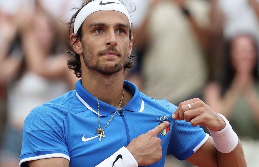 ފިރިހެން ސިންގަލްސް އިން ބްރޮންޒް މެޑަލް ހޯދި އިޓަލީގެ ލޮރެންޒޯ މޫޒެޓީ އެ ފަހުރުވެރި ވަނަ ހޯދި މެޗުގައި ކަރުގައި އަޅައިގެން ހުރި ފަށުގައި އޮތީ، ސައްތައިން ސައްތަ ދިވެހި އުފެއްދުމެއް ކަމަށްވާ، އޮއެވާލި އާޓް ޝޮޕުގެ 'މަންޓާ ރޭ ޕެންޑަންޓް އާތު ގޯލްޑް' އެކެވެ.