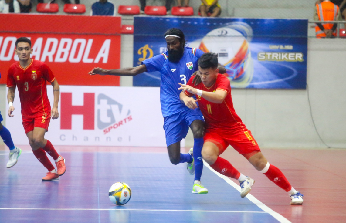 މިއަދު މިޔަންމާއާ ދެކޮޅަށް ކުޅުނު މެޗުގައި ރާއްޖޭގެ ޝިޔާ، މިޔަންމާ ކުޅުންޔތެރިއެއް ހުއްޓުވަން މަސައްކަތް ކުރަނީ.-- ފޮޓޯ: މިޔަންމާ ފުޓްސަލް