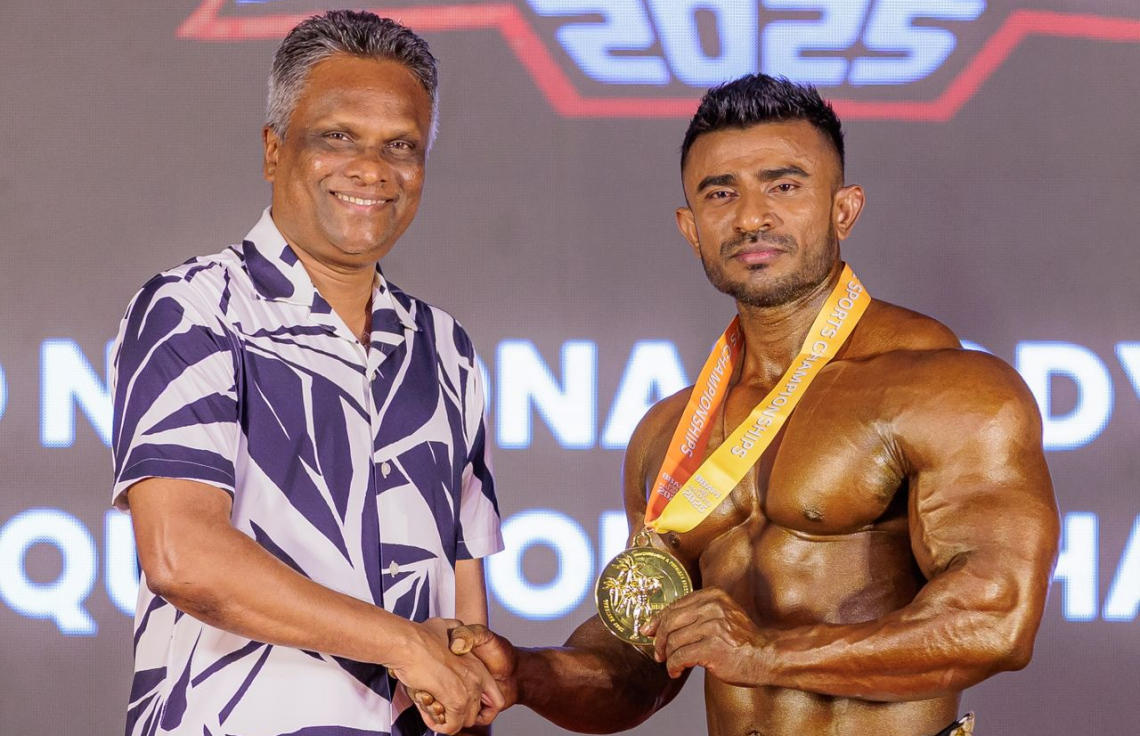 އަޒްނީން (ކ) އަށް މާލޭ ސިޓީގެ މޭޔަރު އާޒިމް މެޑަލް ދެއްވަނީ. -- ފޮޓޯ: ބޮޑީބިލްޑިން އެސޯސިއޭޝަން