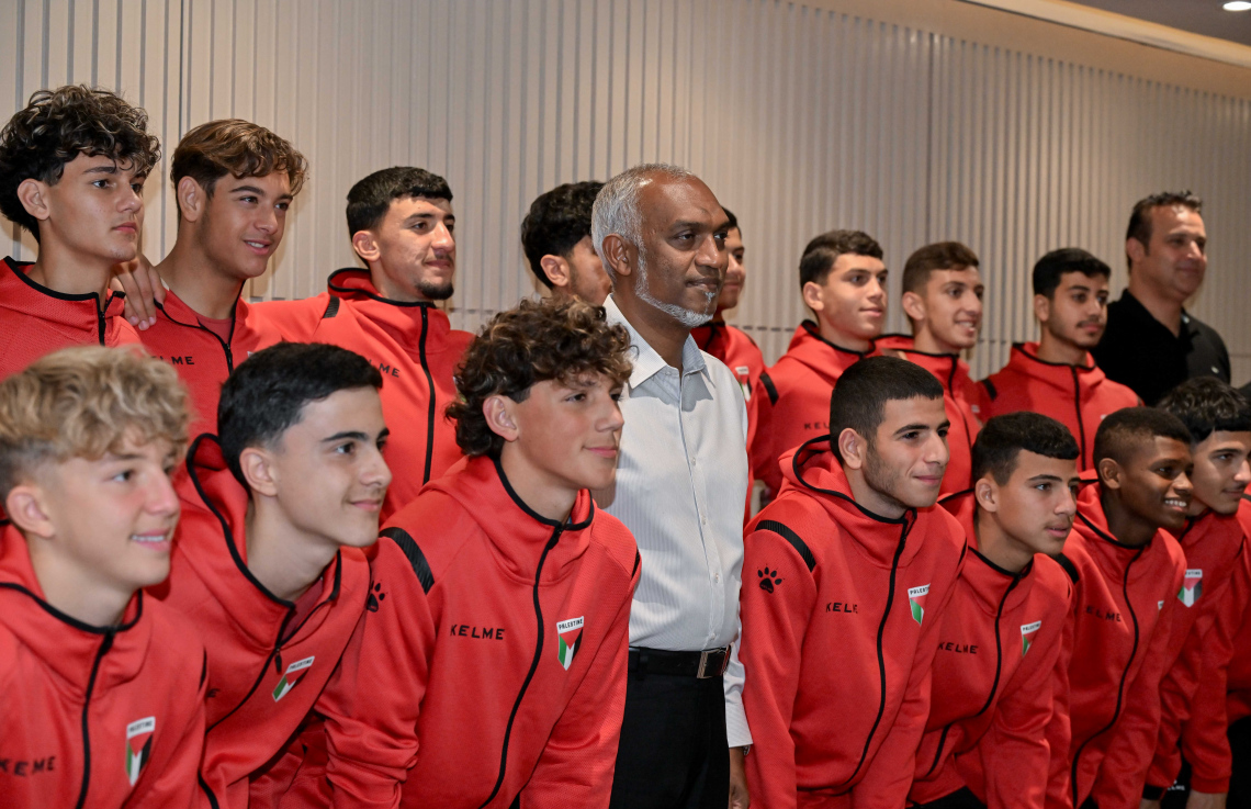 ފަލަސްތީނުގެ ޒުވާން ޓީމާ އެކު ރައީސް ޑރ. މުހައްމަދު މުއިއްޒު: ފަލަސްތީނުގެ ޓީމުގެ ޝަރަފުގައި ރައީސް މިއަދު ވަނީ މެންދުރުގެ ފަރިއްކޮޅެއް ބާއްވަވާފަ --- ފޮޓޯ: ރައީސް އޮފީސް
