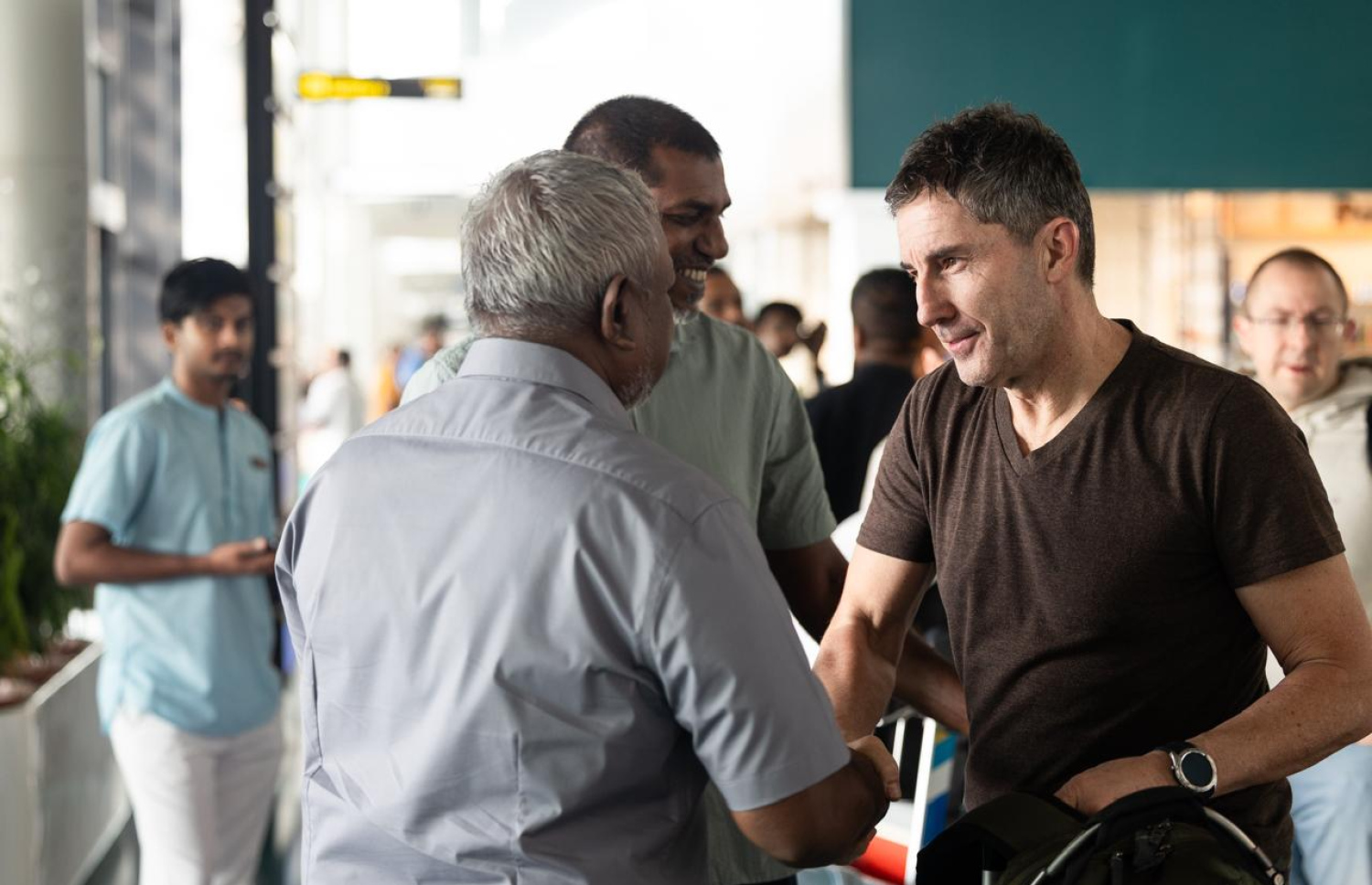 މާލެ އައުމުން އޭނާ އަށް މަރްހަބާކީ އެފްއޭއެމްގެ ނައިބު ރައީސް ހުސައިން ޝާފިއު އާއި އެކްސްކޯ މެންބަރު އަދި ކުރިން އުރްބާނީގެ ކޯޗުކަމުގެދަށުން ކުޅުނު ކީޕަރު އިމްރާން މުހައްމަދެވެ.