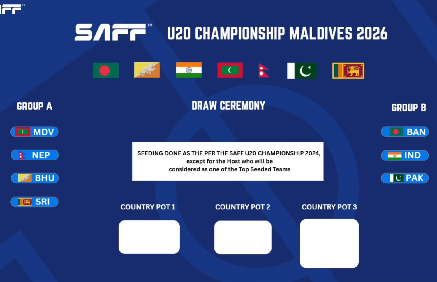 ރާއްޖޭގައި މި އަހަރު ބާއްވަން ހަމަޖެހުފައިވާ 20 އަހަރުން ދަށުގެ ސާފް ޗެމްޕިއަންޝިޕްގައި ދިވެހިރާއްޖެ، ނޭޕާލާއި ބޫޓާން އަދި ސްރީ ލަންކާއާ އެކު އެއް ގުރޫޕެއްގައި ހިމެނިއްޖެ އެވެ.