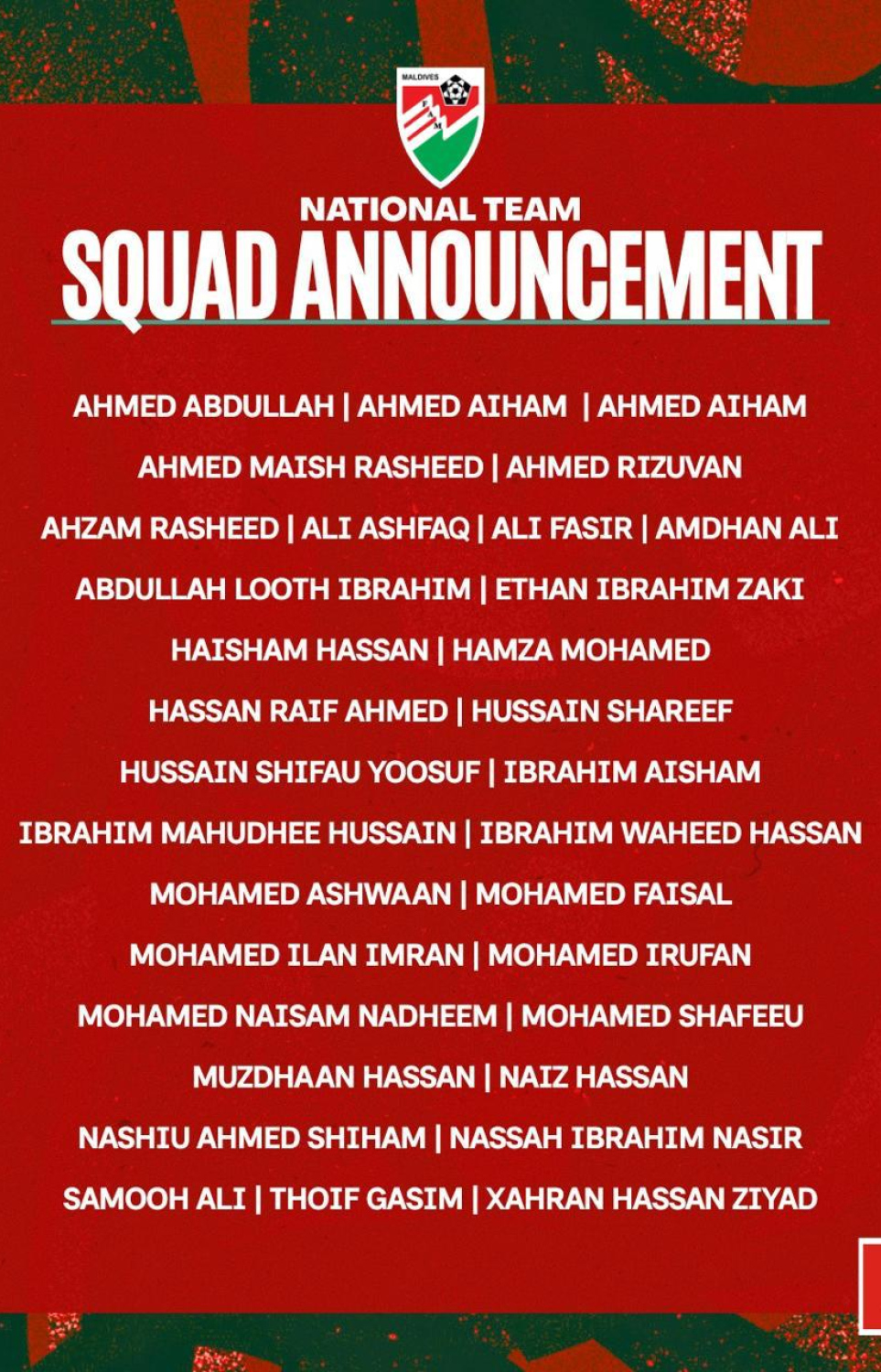 މިއަދު އިއުލާންކުރީ ތަޖުރިބާކާރު ކުޅުންތެރިންނާއި، ޒުވާން ކުޅުންތެރިން ހިމެނޭ ގޮތަށް މަސްހުނި ސްކޮޑެކެވެ. ތަޖުރިބާކާރު ކުޅުންތެރިންގެ ތެރޭގައި އަލީ އަޝްފާގް (ދަގަނޑޭ)، ކެޕްޓަން ސަމޫހު އަލީ (ސަމުއްޓެ)، ގޯލްކީޕަރު މުހައްމަދު ފައިސަލް، އަލީ ފާސިރު (ސެންޓޭ)، އަހުމަދު އަބްދުﷲ (ލިލީ)، އަމްދާން އަލީ (އެންޑީ) ފާހަގަކުރެވެ އެވެ.